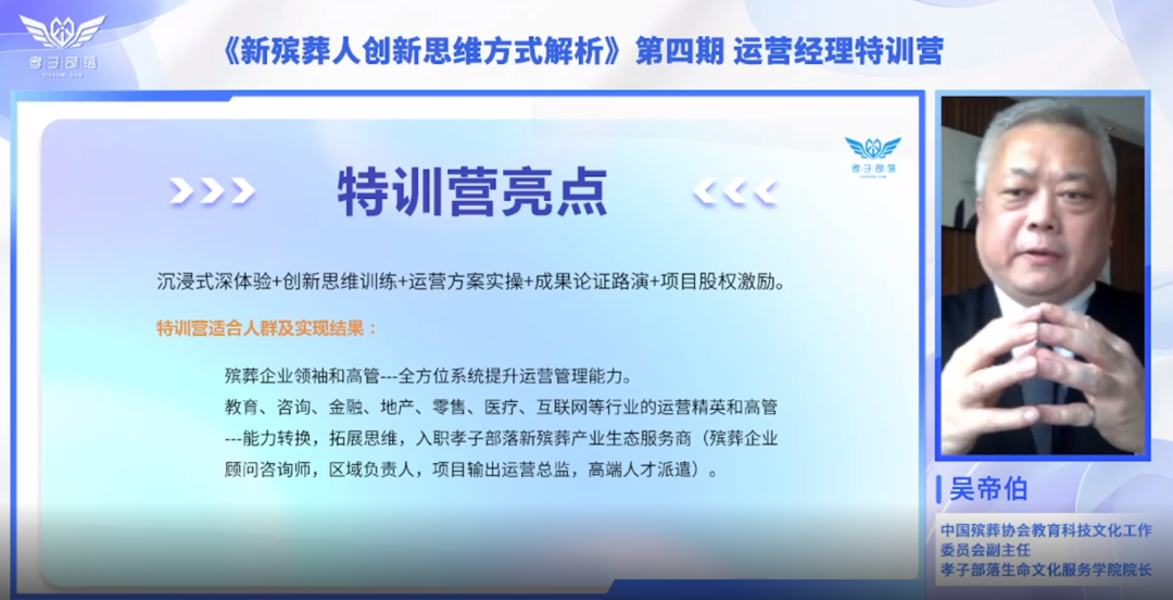 《公司企业文化》、《经营思维创新课》、《殡葬企业发展5年规划》、《创新项目商业计划书》、路演考核